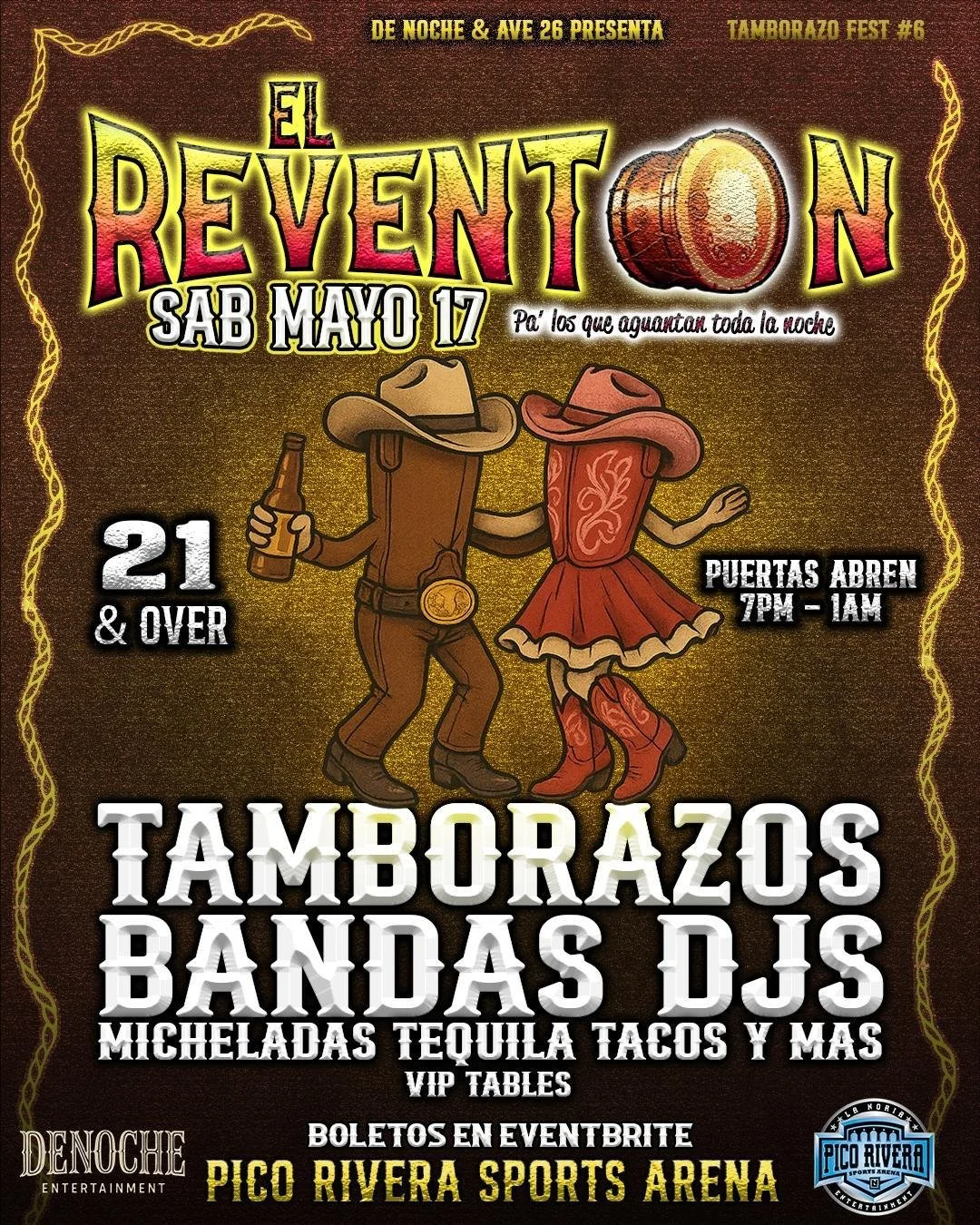 EL REVENTON PA' LOS QUE AGUANTAN TODA LA NOCHE Saturday, May 17, 2025 7:00 PM Saturday, May 17, 2025 11:59 PM Pico Rivera Sports Arena 11003 Rooks Road Whittier, CA, 90601 United States (map) Google Calendar ICS